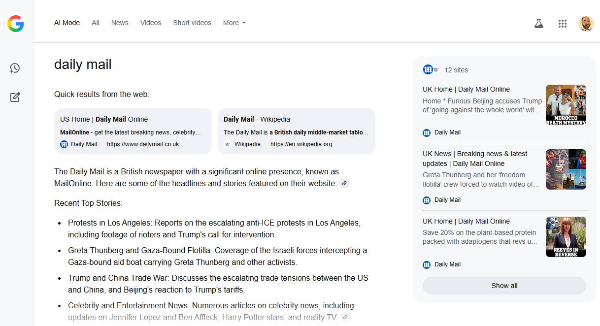 Playing with AI Mode, I’ve seen some answers to news-specific queries that don’t even cite news sources, but link only to Wikipedia. For contrast, the regular Google SERP for the same query features a rich Top Stories box with seven news stories.