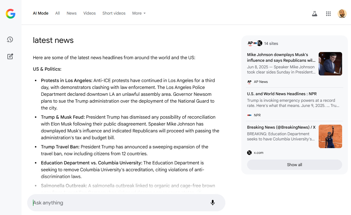 Contrary to AI Overviews, AI Mode will provide summaries for almost any query, including news-specific queries: