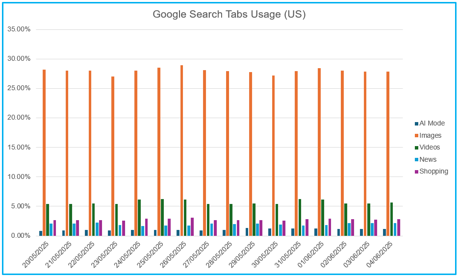 The good news is that user adoption of AI Mode appears to be low. The latest data from Similarweb shows that after an initial growth, usage of the AI Mode tab on Google.com in the US has slightly dipped and now sits at just over 1%.