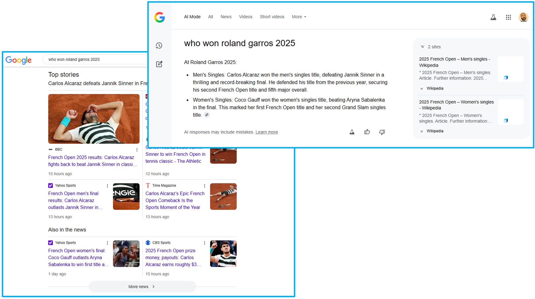 With these types of results in AI Mode, the shelf-life of news is reduced even further. Where in search you can rely on a Top Stories news box to persist for a few days after a major news event, in AI Mode news sources can be rapidly replaced by Wikipedia links. This further reduces the traffic potential to news publishers.